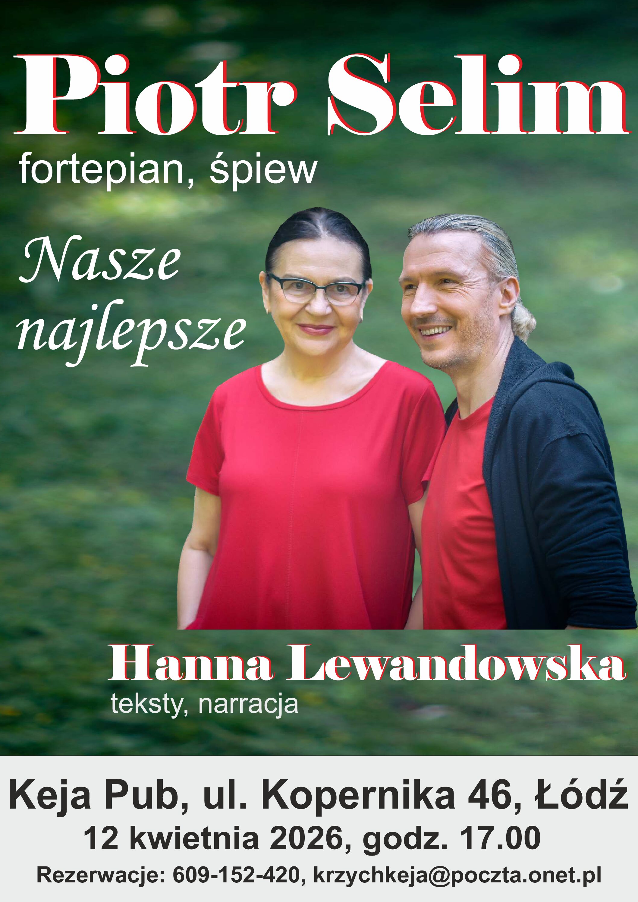Piotr Selim i Hanna Lewandowska to duet artystów znanych od lat na tych scenach, na których króluje piosenka literacka czyli piosenka z dobrym tekstem i odpowiednią do tego tekstu muzyką. Taką muzyką, która ten tekst podkreśli i uwypukli w nim wszystkie wartości, ukaże jego głębię i przesłanie. To artyści, którzy są jednocześnie twórcami. Hanna Lewandowska pozostaje niezmiennie, od wielu lat autorką tekstów piosenek z muzyką Piotra Selima. Koncert w Kei to specjalnie przygotowany program utworów nie tylko docenianych przez publiczność. Także wielu z tych, które znalazły się na solowych płytach CD Piotra Selima i Lubelskiej Federacji Bardów, z którą artyści współpracują od początku istnienia tej legendarnej grupy. Program uzupełnią wiersze i zabawne opowieści Autorki o tym, jak toczy się niekiedy proces twórczy…